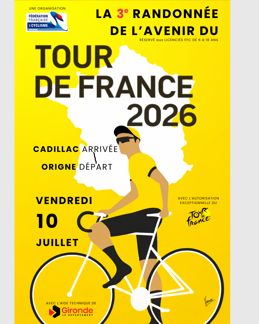 Le Comité de Gironde de Cyclisme organise, avec l’autorisation de la société organisatrice du Tour de France ASO, une randonnée cycliste réservée aux licenciés de la Fédération Française de Cyclisme, âgés de 6 à 18 ans, le Vendredi 10 Juillet 2026, avant le passage de la caravane.
